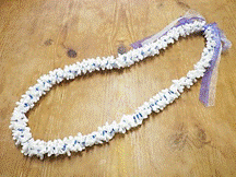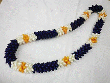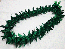 製作者:Naomi.Sさん レイ:「モックオレンジリーフ」 コメント:写真で見た時に縫って作るのかと思いましたが、ウィービングレイで驚きました。珍しい葉っぱのリボンもかわいくて、お気に入りのレイになりました。 |