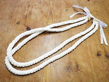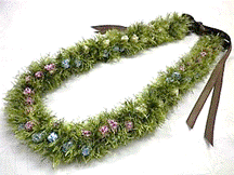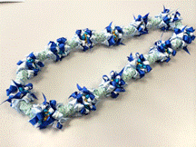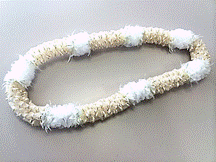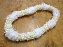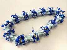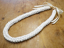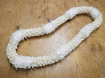製作者:米村孝子さん レイ:「マレアナレイ」 コメント::白いLeiは可愛くリボンをこわさず縮めるのが難しかったです。 |