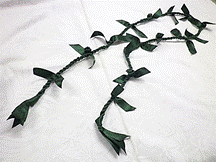 NO.3593 製作者:HARUMIさん レイ:「ホーリー」 コメント:並縫いしてビーズを通していくのに、 きれいに出来ず、苦労しました。リボンを ねじれないようにとても素敵に出来ました。 |