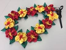 NO.3717 製作者:Naomi.Sさん(石川町教室) 日にち:2017年7月19日 レイ:「ナーカイマウナロア」 コメント:印付けなしで、短時間で出来上がる のに、見た目が華やかで使っているリボンも素敵で、色違いも作ってみたくなりました。 |