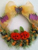 NO.806 製作者:Sizuka.Aさん コメント:先生の本のクリスマスリースを応用して「ハローウィンリース」です。クロシェットローズのレッスンは受けてないので本と格闘しての製作でしたが〜なんとか仕上がったので。。。良しとしておきます (笑) |