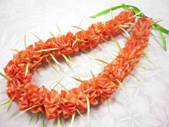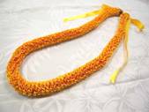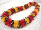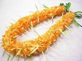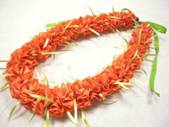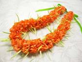 NO.2024 製作者:Masami.Aさん コメント:オレンジ色で作製しました。マリーゴールドのお花が沢山連なったレイ、 リボンの素材違い(オーガンジー等)、色違いで いくつも作ってみたい作品です。 |
