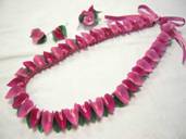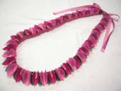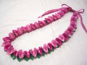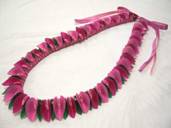NO.2200 製作者:Masako.Oさん レイ:「アンスリウム」 コメント:ハート型に切っている時からウキウキ気分。かわいらしいレイです。 |
