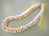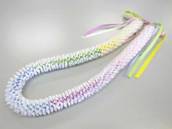 NO.2404 製作者:Hiromi.Tさん レイ:「プルメリア」 コメント:プッシュのコツを忘れないように、もう1本作ってみました。リボン幅が広いほどむずかしい様です。 |