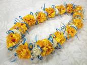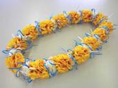 NO.2430 製作者:Masami.Aさん レイ:「ハイビスカス」(黄色) コメント:黄色のハイビスカスが沢山でボリュームのあるレイに仕上がりました。ブルーのリボンがインパクトあると思いました。 |