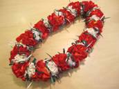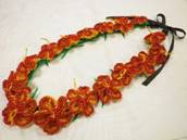 NO.2524 製作者:Naomi.Tさん レイ:「ハイビスカス」 コメント:ハイビスカスのお花のパーツ作りが大変でしたが、仕上がりがゴージャスで華やかなレイになりました。 |