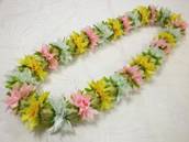 NO.2523 製作者:Yoshimi.Iさん レイ:「ハイビスカス」 コメント:案外簡単な割には豪華で綺麗、葉っぱがステキです。 |