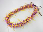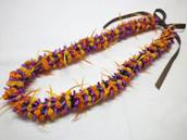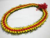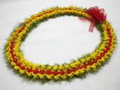 NO.3024 製作者:Harumi.Sさん レイ:「3ストランドフラワーローズ」 コメント: 編むのが好きでうれしかったの ですが、赤いラットテールコード60個ローズを作れたのですが、黄色い方ができずに3回かたく編み直しました。指が痛くなりましたが、やっと出来てキレイにできたので“ホッ”としました。 |