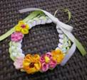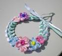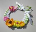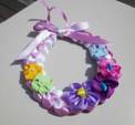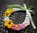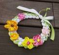 リボンを編んで作ったリースの上に、春色の花をたくさん飾って♪ |