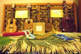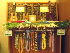 ウクレレのKen Moriya先生の手作りウクレレと、Leinaniリボンレイのコラボ・ミニ展示。