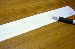 まずは、マーキングスケールとボールペンを使って、リボンに印付け。