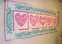 左写真:パウスカート 中央写真:ハートのフレンドシップキルト 左写真:額入りキルト