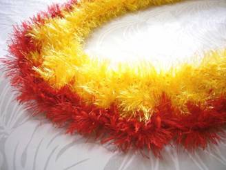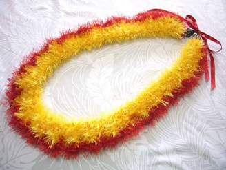貴重な赤と黄色の鳥の羽を何年もかけて集めて作ったケープを イメージしたレイです。