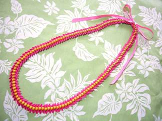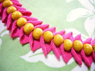 2本のリックラックテープを使って、チクチク縫っていくレイです。 間にウッドビーズが入っています。 ウッドビーズの代わりに、パールビーズで作ってもカワイイかも♪