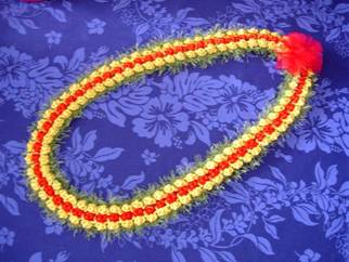 Rattail cordとFunny Yarnで作っています。 赤と黄色のロイヤルカラーで作ってみました。 まるで王様がかけていたかのような、ボリュームがあって高貴な感じのレイになりました♪