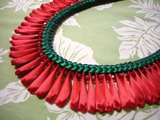 ハイビスカスは「情熱の花」と言われ、ハワイ州を象徴する花として、ハワイの人々に愛されてきました。 しかし残念なことに夕暮れと共にしぼんでしまう1日花。レイにするにはとても難しい花でした。 花びらが早朝わずかな時間だけ開き、あとは眠ったように閉じたままの“スリーピング・ハイビスカス”は 比較的長持ちするので、唯一レイが作られます。 平らに蕾を並べて編み込む“ミクロネシアン・スタイル”のレイをイメージして作りました♪