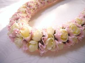 「Halau」(ハラウ)とは、フラの学校を意味します。 もともと1本のリボンだけで作るプレーンなレイがあり、それを「Halau Lei」(ハラウ・レイ)といいました。 そのレイに二重のリボンとピカケの花が加わることで、フラを学ぶ多くの学生、多くのフラの学校の繁栄を表しています。 淡いカラーとピカケのコンビネーションが女の子の心をくすぐる、可愛いレイ。 ウェディング・レイとしても人気のあるレイです♪