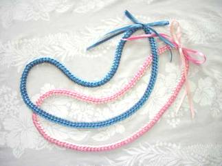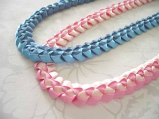糸と針を使わず、手でリボンを編んでいく手法です 同じ太さの2本のリボンを編み込んでいきます お色の組合せはお好みで… ハワイではスクールカラーで作って、卒業生にプレゼントします♪