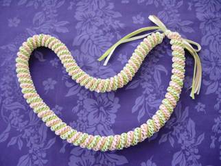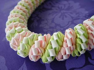 サークルウィーブ3カラーズは、針と糸を使わず手で編む手法の一つです。 6本のリボンを編んでいきます。 編み順に慣れるまでちょっぴり複雑ですが、慣れてしまえばとても楽しく編めます♪ まるでマカロン(お菓子)みたいなレイになりました。