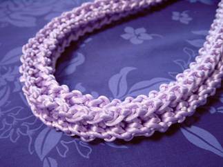 ラットテールコードをかぎ針で編んでいきます。 四角くて、ちょっと面白い♪ オアフ島の「セネターフォングプランテーション」に行ったら、おじさんが天秤の籠いっぱいに 朝摘みのクラウンフラワーを入れて運んでいました。レイにするんですって! 広大な敷地で栽培されていました。