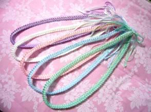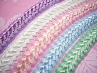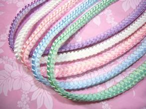 ブレードレイは、リボンレイの第一人者キャロル・ミトさんが、 息子さんのボーイスカウトの制服の肩から下がっている組み紐のような物(飾緒)をヒントに考案されたレイ。 ダブルブレードはそのアレンジです。 4本のリボンを、針と糸を使わずに手で編んでいきます。 光沢のあるサテンリボンとキラキラ光るジュエルリボンを使って、ラブリーな感じに仕上げてみました♪