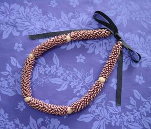 リボンにウッドビーズを先に通してから、ピカケステッチで縫っていきます チョーカーなので、少し短めのレイです シックなレイなので、男性もOK!!