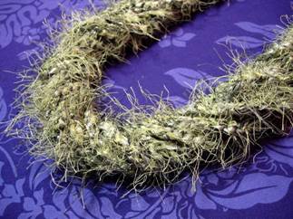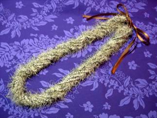 Eyelash Yarn2色とサテンリボンで、かぎ針でくさり編みをして作りました。 シルバーグレーの色合いがヒナヒナによく似てるでしょ♪