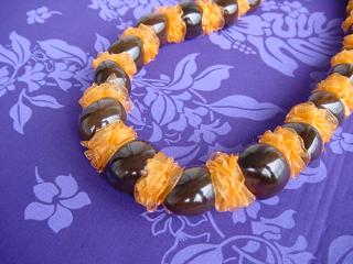 オレンジはイリマを表しています オーガンジーリボンをクシュクシュ縫って、間にククイナッツを挟み込んでいます とっても簡単スピーディーに作れます♪