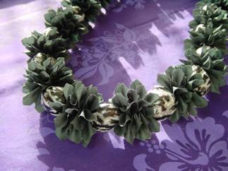 モックオレンジの葉とククイナッツのレイ。 ちょっと変わったククイを使って、作ってみました♪ ククイの重みで、少しズッシリとします。 男性がこのレイをすると、カッコイイかも!?
