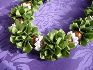 グリーンはモックオレンジの葉、ウッドビーズの間の白はナウパカの花を表しています 男女問わず、どちらにも使えるレイです ビーチナウパカとマウンテンナウパカがあり、合わせると雨が降る… ナウパカの花には有名な悲しい恋の伝説があります