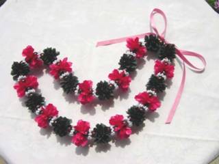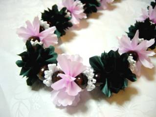 ナウパカ&モックオレンジのレイの間に、シャクナゲのお花を挟んでいます。 スカラップハサミでリボンをトリミングしています。 このレイは、ハラウの5周年パーティーイベントの一環として製作依頼があり、お作りしてお嫁入りしました♪
