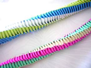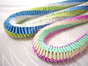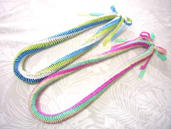 針と糸も使わずに作れる、手編みのレイです。 リボン色や幅はお好みで。サテンリボンとピコリボンで作ってみました♪