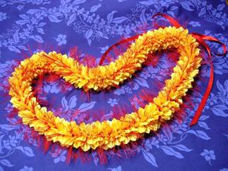 この花の色を見ると、ビショップ・ミュージアムなどに展示されている、かつてのハワイ国王が身にまとった マントやかぶとを思い出します。当時、赤と黄色の花や鳥の羽根はとても貴重だったため、 “ロイヤルカラー”として、王族だけが身にまとうことができました。 長い花糸が特徴のお花のレイをイメージして作りました♪ 赤や黄色、山吹色のハードリボンをそれぞれカットし、 幅広リボンをフリンジにして、針に刺していきます。 「オハイアリイ」は、アラモアナS.C.やホノルルZOOでも見ることができます♪