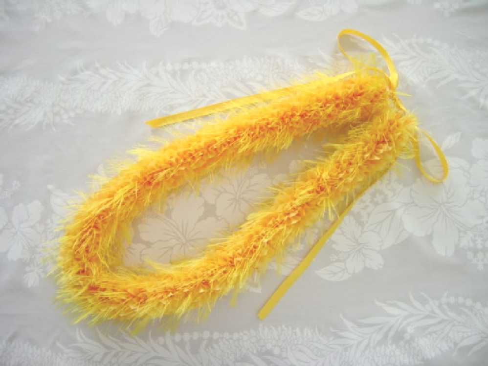 オハイアリイは”オオゴチョウ”、メレメレは”黄色い”という意味です 幅広のリボンを細かく裂いてフリンジにし、黄色の花びらの中に挟み込みながら縫っていきます ファーのようになっているのが特徴で、とてもボリュームがあります
