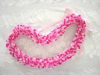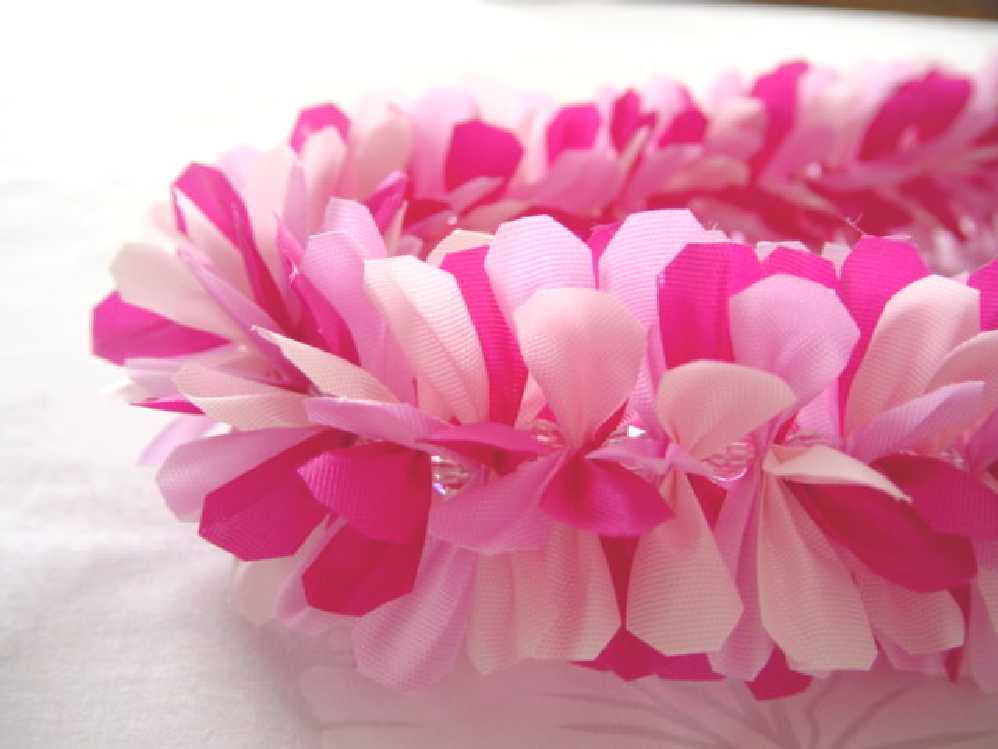 ピンクの濃淡3色のリボンを使っています リボンのふちを花びら状にカットしたパーツを作り、それを針に通していきます 間にキラキラビーズも隠れています とっても華やかな感じ♪