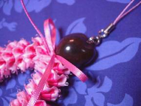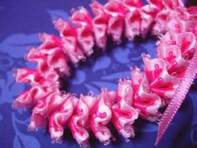 ピンクの濃淡の、幅の異なるPicot Ribbonを一緒に、ランニングステッチをし、縮めて作ります。 バッグにつけてもカワイイ〜♪ (「FELISSIMOコレクション Couturier[クチュリエ] 2006年春夏号にて、ストラップキットが買えます!)