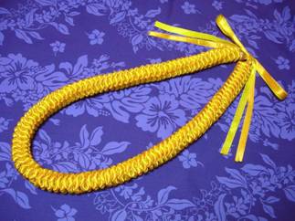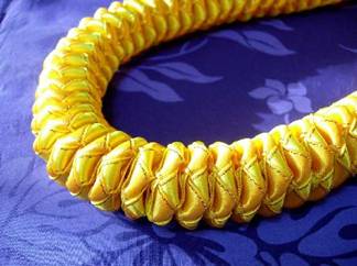ブレードレイのアレンジです。 ブレードレイを編んだ後に、糸で縫い縮めていきます。 オレンジとイエローゴールドのラメリボン(以前より少し細め)で、改めて作ってみました。 雰囲気がかなり変わりますね!