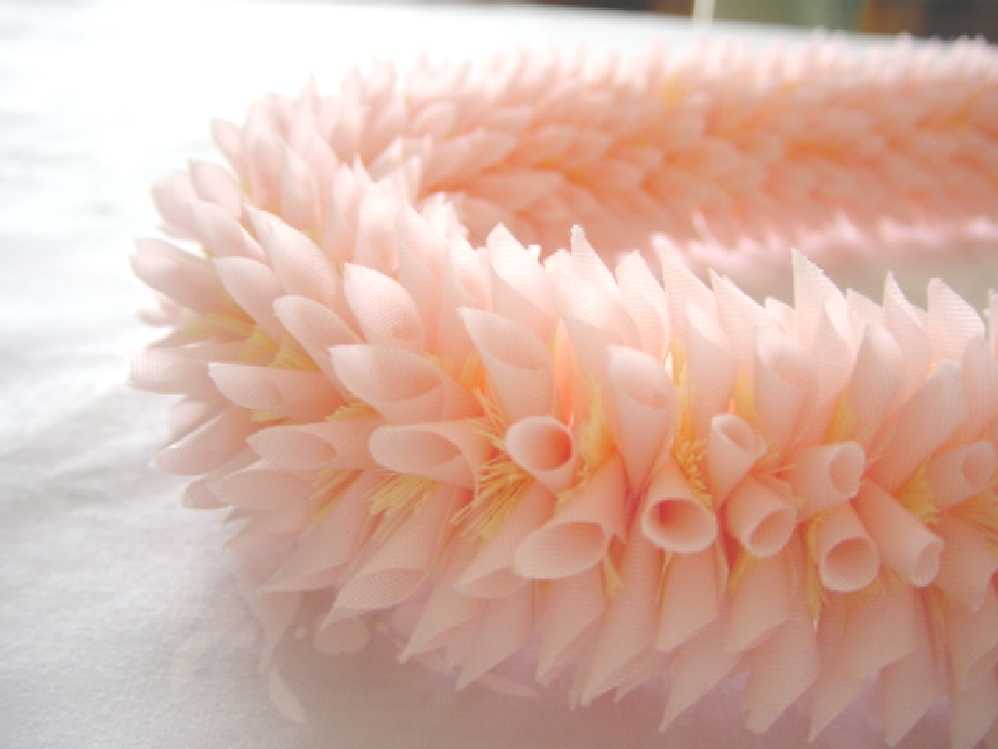ハードリボン、丸めながら針に通します パーツの間にふさふさのフリンジが入ります ちょっぴり根気が必要ですが、できあがりはとっても素敵です♪
