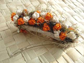 3mm幅のリボン2色と、Eyelash Yarn2種を使って、 ローズクロシェットを編み、バレッタにしてみました。 レイとお揃いで作ったら、素敵かも♪