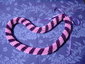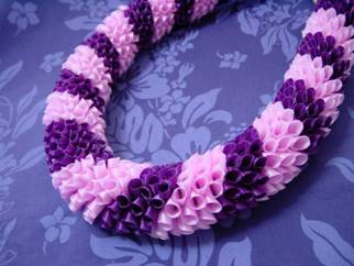 ハワイのレイショップでも見掛けるダリアのレイです。 2色のリボンを、丸めて針に通していきます。 リボンが少しづつずれていくように配置していて、ツイストしています。 今回、細めのリボンで作ってみました♪
