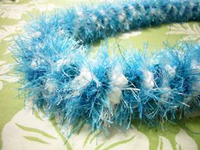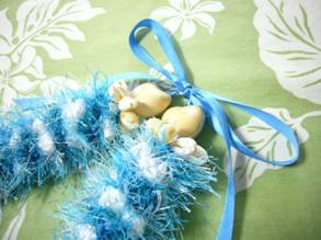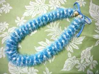 クロシェットレイの中でもこのレイはもっとも基本的な、ライフラインのリボンに毛糸などを編み込んでいく手法のレイです。 とても素敵に、しかもとても簡単に作れることから、ハワイでも大人気のレイです。 プロのサーファーが集まるサーフィンの聖地、ノースショアのビッグウェーブをイメージして、 ロイヤルカラーとホアワイトで作ってみました♪
