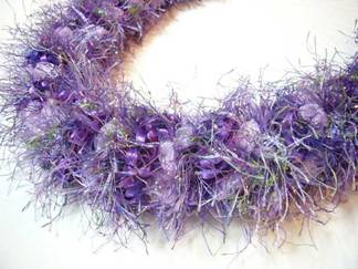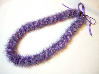 「ブルーハワイ」と同じく、「バイオレット」も、ライフラインのリボンに毛糸などを編み込んでいく手法のレイです。 組み合わせる色や材料を変えると、かなり雰囲気が変わります。 このレイは、野に咲くスミレをイメージしました。 間にオーガンジーリボンやキラキラ光る毛糸が入って、シックな雰囲気になりました♪
